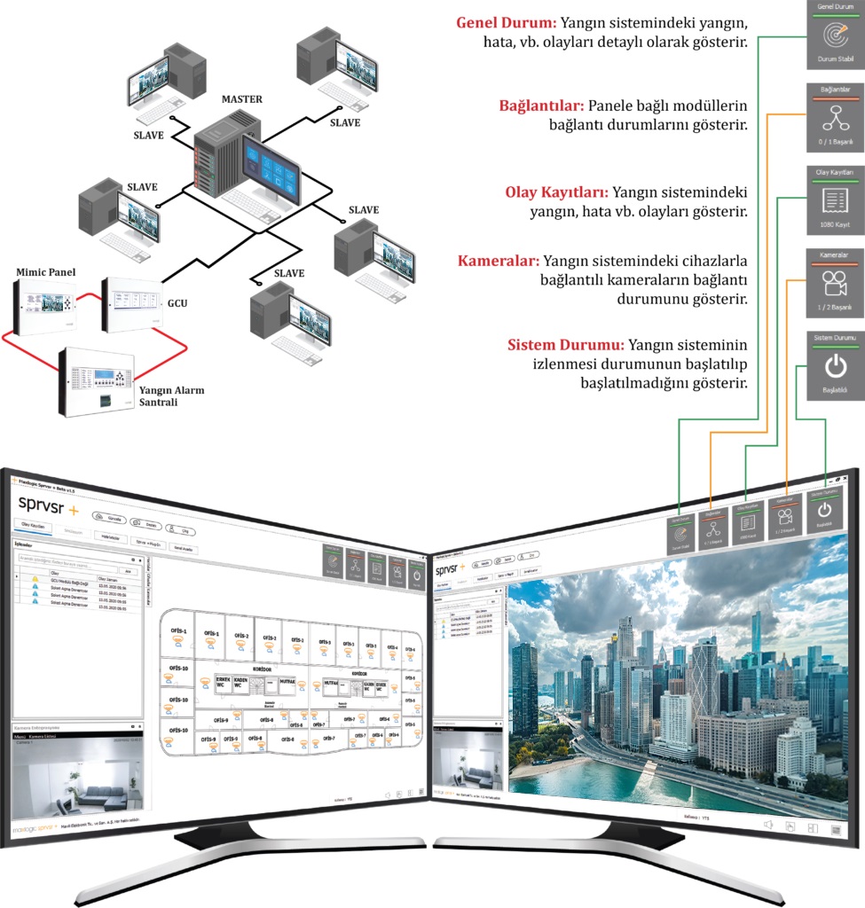 ◗ Her biri 64 santralden oluşan 1000 adet network izlenebilir. ◗ Olay kaydı görüntüleme, kaydetme ve yazdırma seçenekleri ◗ Cihazların harita üzerinden manuel olarak kontrol edilebilmesi ◗ Sprvsr+ programında yer alan “Kolay Gösterge” ekranı sayesinde takip kolaylığı, hatırlatıcı oluşturma, veritabanı yedekleme ve geri yükleme gibi kontrol işlemlerini yapabilme ◗ Simülasyon seçeneği kullanılarak, gerçek olmayan bir yangın olayı ile haritaların, cihazların ve sistem çalışmasının kontrolünün sağlanabilmesi ◗ SPRVSR+ yazılımı çatı yazılımlar ve Bina Yönetim Sistemleri (BMS) ile yazılımsal olarak entegre çalışmaktadır.